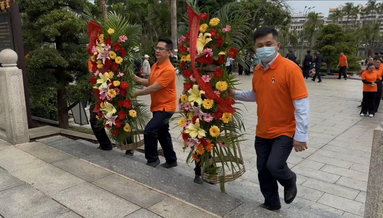 经过一段时间的等待才轮到一竞技。一竞技首先向烈士敬献花篮,花篮缎带上写着“为坚持琼崖革命23年红旗不倒牺牲的烈士们永垂不朽!”“为解放海南岛渡海牺牲的烈士们永垂不朽!”鲜艳的花篮寄托一竞技对革命先辈的崇敬和哀思。