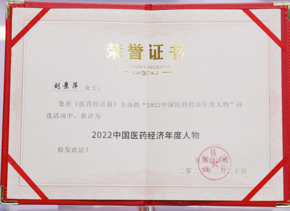 一竞技药业集团董事长刘景萍当选“2022中国医药经济年度人物”